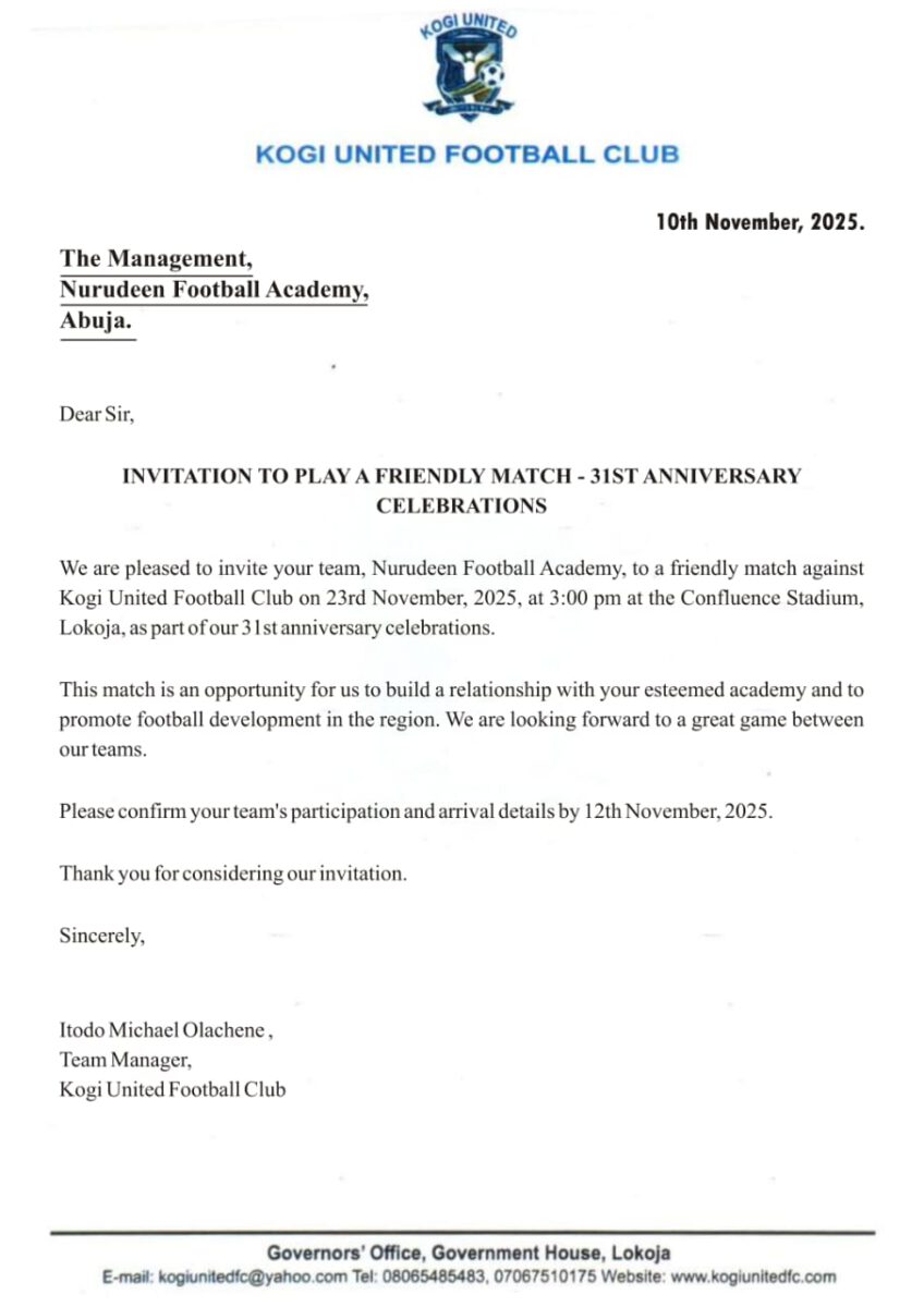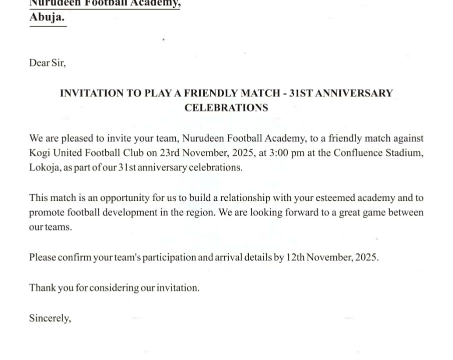 Nurudeen Football Academy has proudly accepted Kogi United FC’s invitation to feature in their 31st Anniversary celebration friendly! Join us on Sunday, 23rd November 2025 at 3:00 pm as our talented youngsters take on the experienced Kogi United side at the iconic Confluence Stadium, Lokoja.