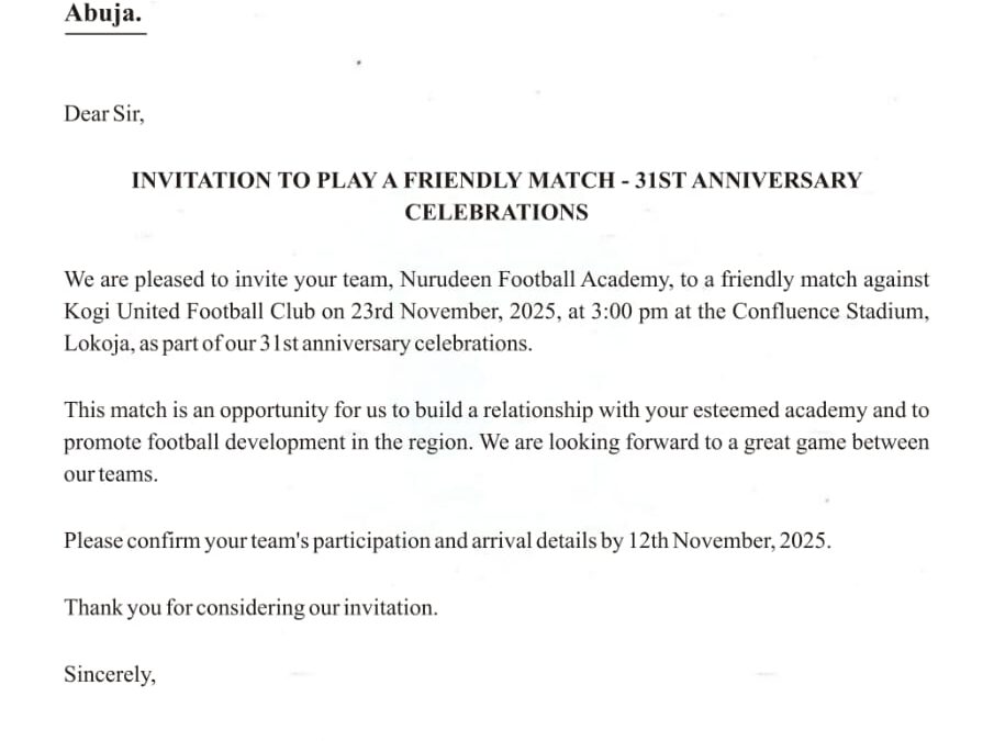 Nurudeen Football Academy is proud and delighted to confirm that we have formally accepted the prestigious invitation from Kogi United Football Club to play a high-profile friendly match as part of their 31st Anniversary celebrations.